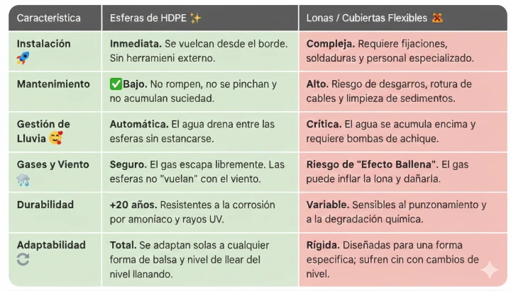 A diferencia de las lonas, que pueden generar bolsas de gas peligrosas o acumular agua de lluvia, las esferas ofrecen una cobertura dinámica: